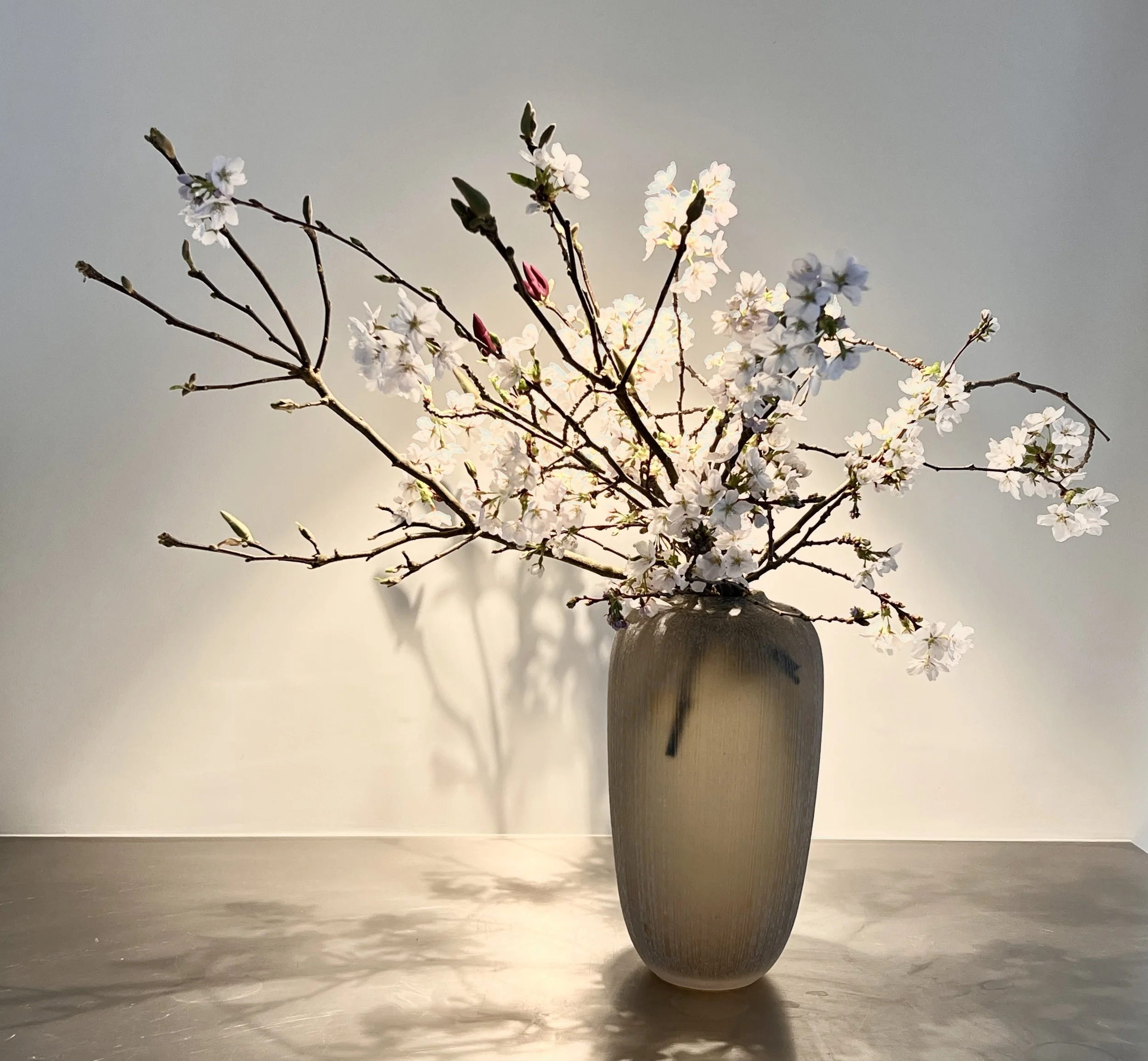 Cherry branches with a magnolia twig so fresh that the flowers opened almost immediately.