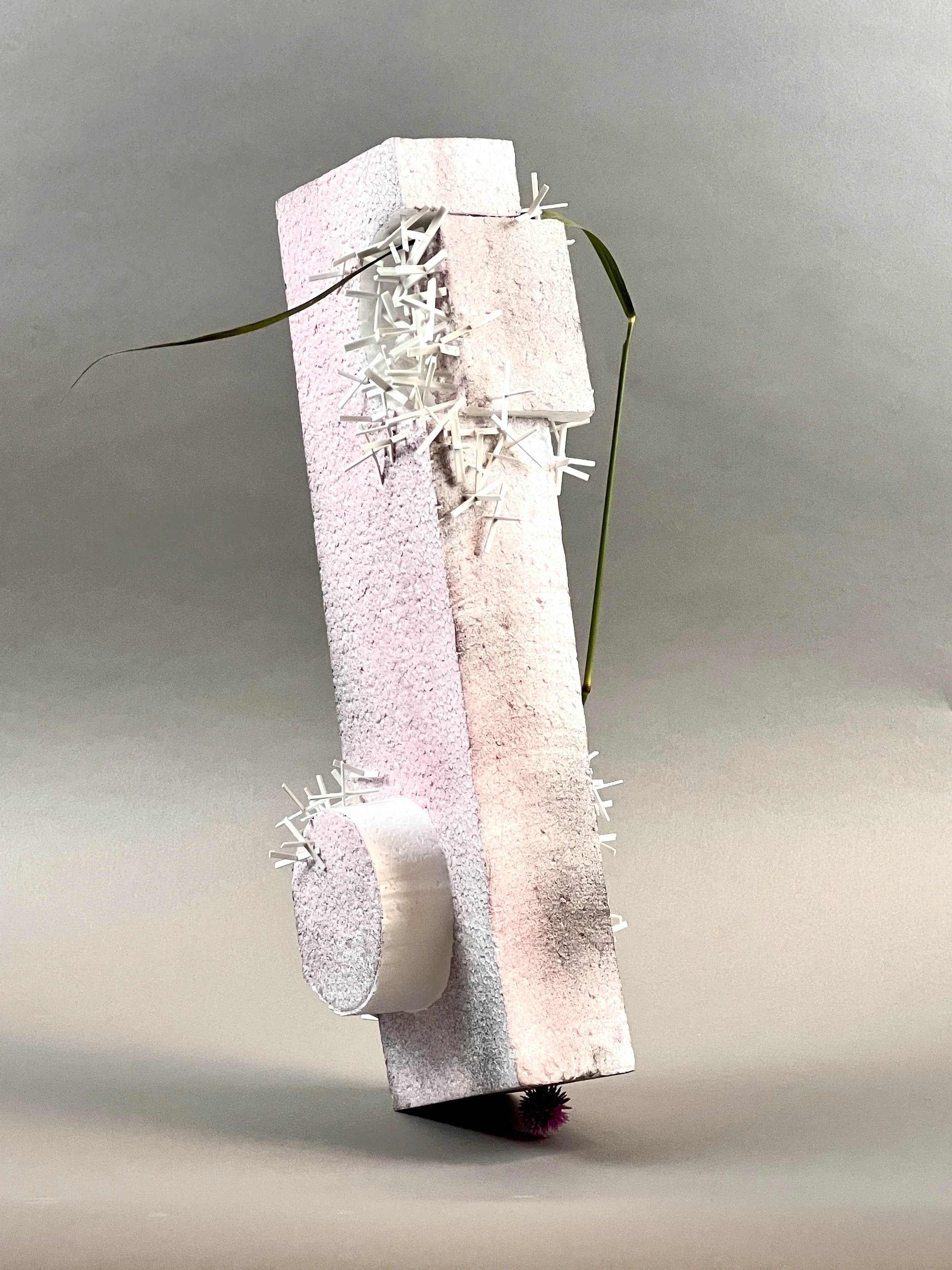 Last weekend at the double workshop by Sogetsu Branch Netherlands, arrangements were created inspired by the oeuvre of Kasumi Teshigahara, the second iemoto of the Sogetsu School. Unfortunately she passed away young but left behind an impressive variety of work. Characteristic of her style are dreamy and fairy-like arrangements. One assignment was that day executed with modified styrofoam and a variety of materials. For this piece, three additional materials were used, including a blade of grass. The source of inspiration was a distant view over a sea with misty weather.